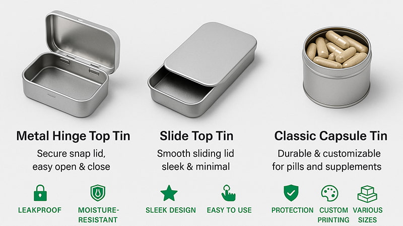 Both styles offer FDA-compliant tin packaging solutions for supplements—choosing between them depends on your brand’s product type and customer experience goals.