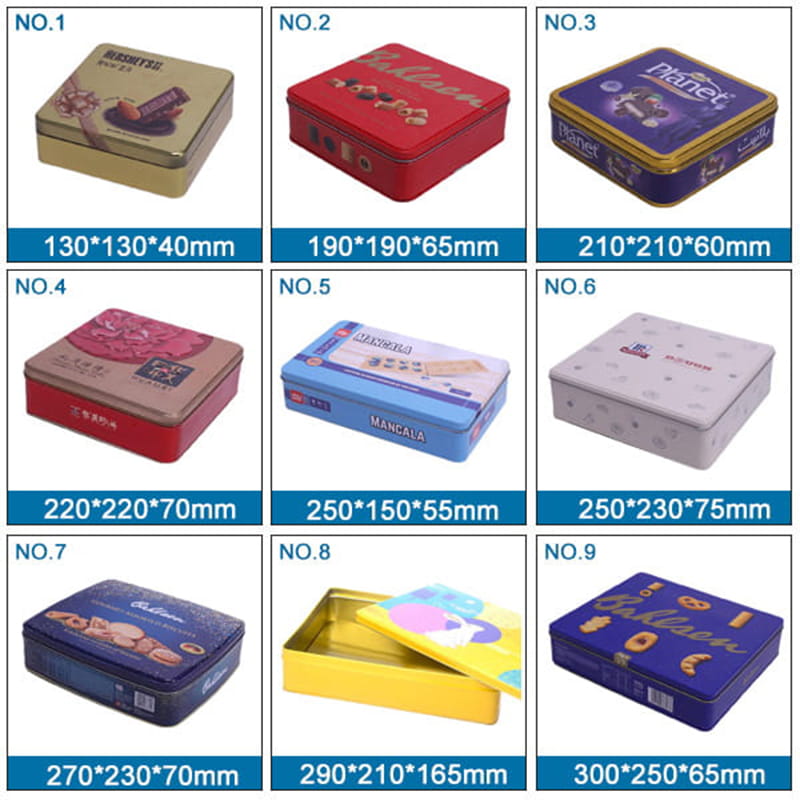 Ce boîte en métal est généralement utilisé pour les emballages de bonbons et de chocolat, la taille est de 220 * 220 * 68 mm, il est fabriqué en fer blanc de 0,23 mm d'épaisseur, avec impression CMJN 4 couleurs ou panton, maintenant nous prenons en charge votre conception personnalisée et la fabrication de nouveaux moules.