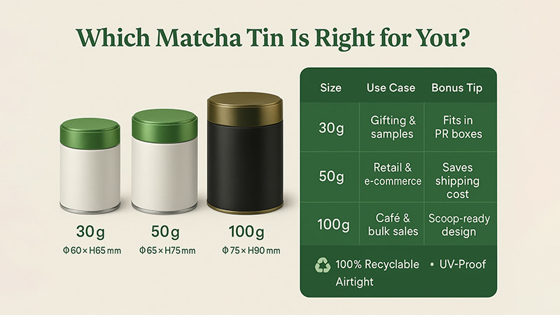 Need a tall, narrow tin for mailers? Or a wide one for premium kits? We support flexible sizing to suit your brand—offering custom matcha tin solutions to fit any packaging ecosystem.