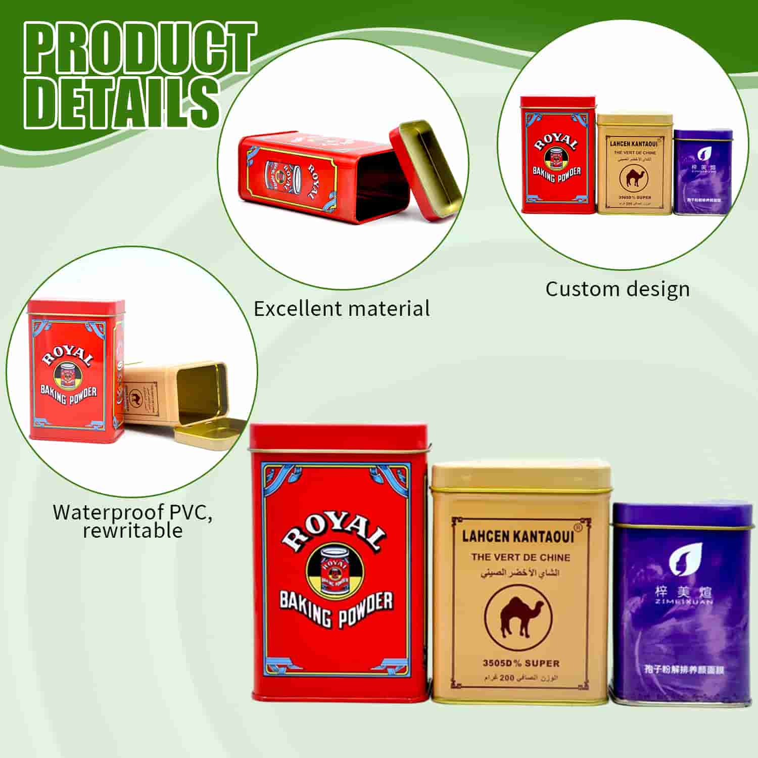 Fabriqué en fer blanc de qualité alimentaire, adaptable à diverses applications.Robuste et protection contre l'humidité et la lumière, longue conservation du contenu.Offre plusieurs tailles et styles, pour s'adapter facilement à votre demande diversifiée.Personnalisable avec des logos et des designs, répond aux besoins de la marque ou aux besoins individuels en matière d'emballage.Réutilisé pour le stockage ou comme objet de décoration, recyclable et respectueux de l'environnement.